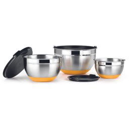 Комплект от 3 купи от неръждаема стомана със силиконова основа и капак. Купите Origen могат да се използват за смесване, приготвяне на салати, паста, размразяване и много други неща. Снабдени са с капак, което позволява да се използват като съдове за съхр89,97 лв. (46,00 €)Доставката не е включенаPIP.BG